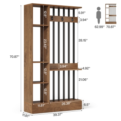 71" Wall Room Divider, Wood Freestanding Wall Partition Bookcase with Coat Hooks